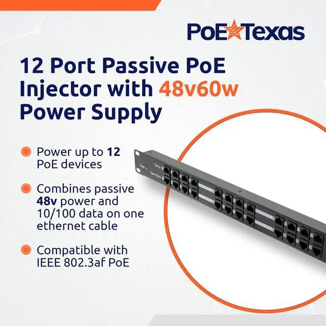 Add passive PoE to an existing network switch, or expand your network's number of PoE devices with this streamlined 12-port PoE injector. ^^ Includes a 48 volt 60 watt power supply, UL Certified for safety and reliability. Use with your existing network switch or router to deliver 1:1 (LAN: PoE) Power over Ethernet on Mode B (+4, 5 - 7, 8) of your Cat5e, Cat6, or Cat7 cables. ^^ All of our PoE Texas products are backed by a 1-year manufacturer's warranty and expert US-based technical support from Austin, TX. For assistance, please call 512-479-0317.