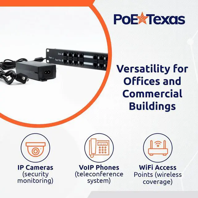Power up to 12 PoE devices on this single rack-mountable PoE injector unit, integrating passive 48v power and 10/100 data speeds onto one Ethernet cable for efficient network management. Compatible with IEEE 802.3 af PoE (Type 1). ^^ Use this midspan injector for VoIP phones, WiFi Access Points, IP cameras in security and surveillance systems, and more. Ideal for WISP, IT professionals, and network integrators working in network closets, rack spaces, or commercial buildings. ^^ Simple plug-and-play installation eliminates the need for complex configurations or any rewiring.