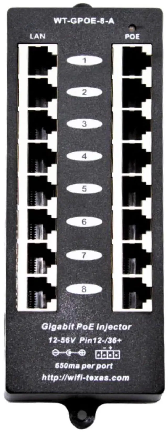 ^^ Dual power inputs: Includes a 48 volt 60 watt UL/CE/FCC certified DC power supply for IEEE 802.3 af applications. Or, directly wire a 240w power supply to the green Phoenix connector and deliver up to 30w per port for 802.3 at devices.