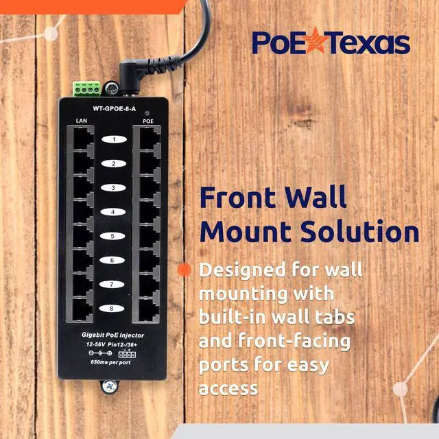 Simplify installations, cut costs, and instantly upgrade your network to PoE using this unmanaged midspan passive PoE injector with 8 Data In (LAN) ports, 8 Data + Power Out (PoE) ports, and 10/100/1000 Gigabit data capability. ^^ Supply continuous Power over Ethernet for up to 8 passive 802.3 af devices like IP security cameras, VoIP phones, WiFi Access Points, and other low voltage devices. Gigabit PoE injector delivers transparent VLAN passthrough. ^^ With built-in wall tabs, this Passive PoE midspan can be mounted to the wall to save valuable desk or rack space.