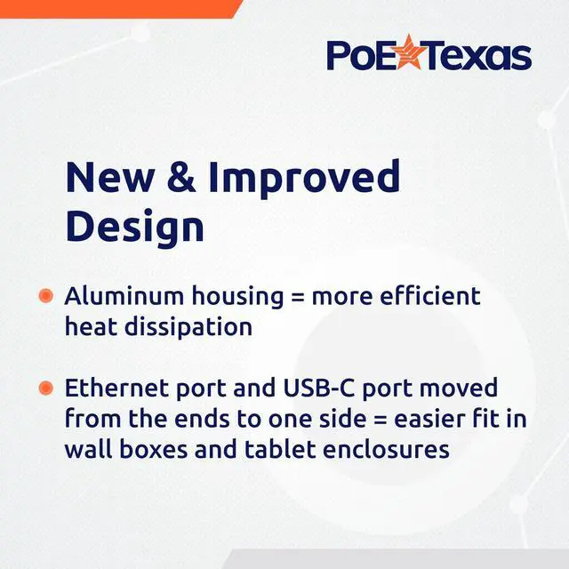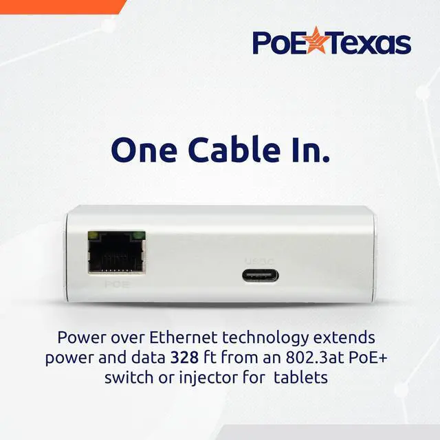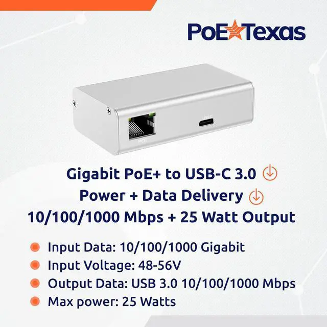 Improved features and upgraded design: an aluminum housing for enhanced heat dissipation, and ethernet + USB-C ports now located on the side for an easier fit into tablet enclosures and installed wall boxes. ^^ Offers a working solution for installing tablets, kiosks and schedulers where you need them using PoE technology. Compatible with an IEEE 802.3 at PoE+ switch or injector (sold separately). ^^ 25 Watt Output (5V 2.6A, 9V 1.78A, 12V 1.34A, 15V 1.37A, 20V 1.15A ). Backed by a generous 1-year warranty. Expert help is only a phone call away 512 479 0317. This product is protected under U. S. Patent No. 11, 627, 004