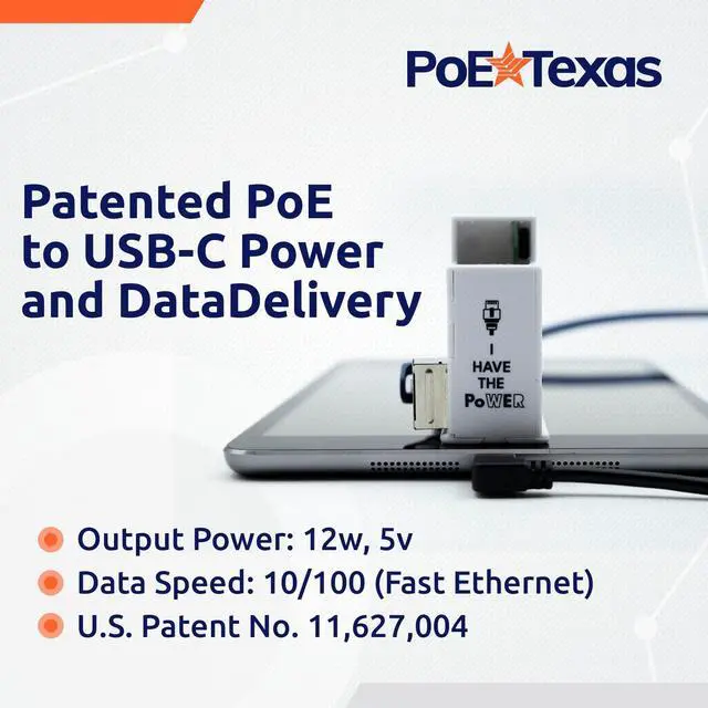 Important: NOT compatible with Echo Hub due to its unique power delivery profile requirements. ^^ Exclusively engineered by PoE Texas, experts in the field of Power over Ethernet solutions. This device is backed by U. S. Patent No. 11, 627, 004, underscoring the