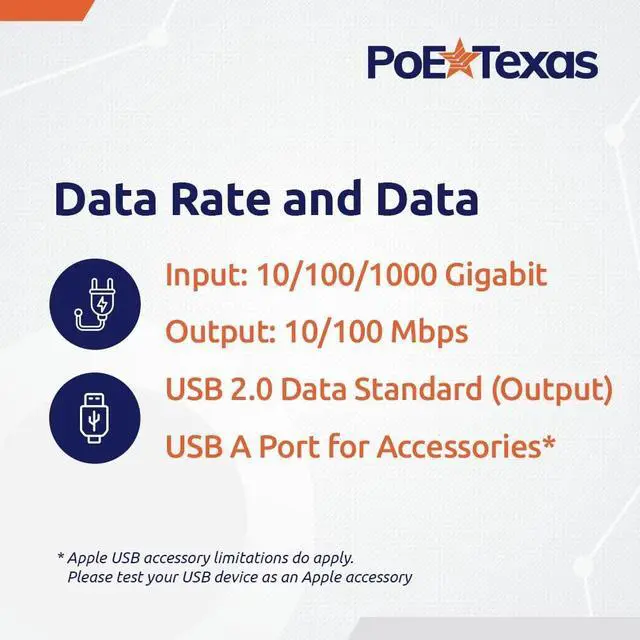 Power Delivery (PD) profiles: 5V 2.6A, 9V 1.78A, 12V 1.34A, 15V 1.37A, 20V 1.15A. ^^ Provide power and data to iPad Pro/Air/Mini, Microsoft Surface Go, Samsung Tab A*, Samsung Tab S, and Google Pixel while also communicating and powering a USB A device like mouse, keyboard, card readers, storage devices, QR code scanners, barcode readers, receipt printers, and ARM controllers. ^^ Compatible with Apple Tablets, Google Pixel, Surface Go, Surface Pro, Samsung Tab A, Samsung Tab S, Samsung Galaxy, Fire, and more. Requires an IEEE 802.3 at PoE+ switch or injector (sold separately); Compatible with Cisco when port settings allow for 30 watts output, 2-Event PoE+. ^^ Backed by a generous 1-year warranty. Expert technical support from Austin, Texas available. Please call 512 479 0317. PoE Texas has a full line of PoE switches and injectors compatible with your application. This product is protected under U. S. Patent No. 11, 627, 004.