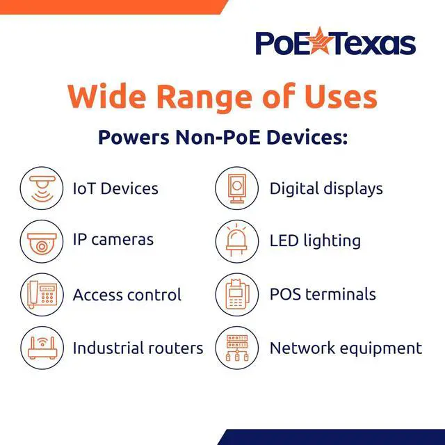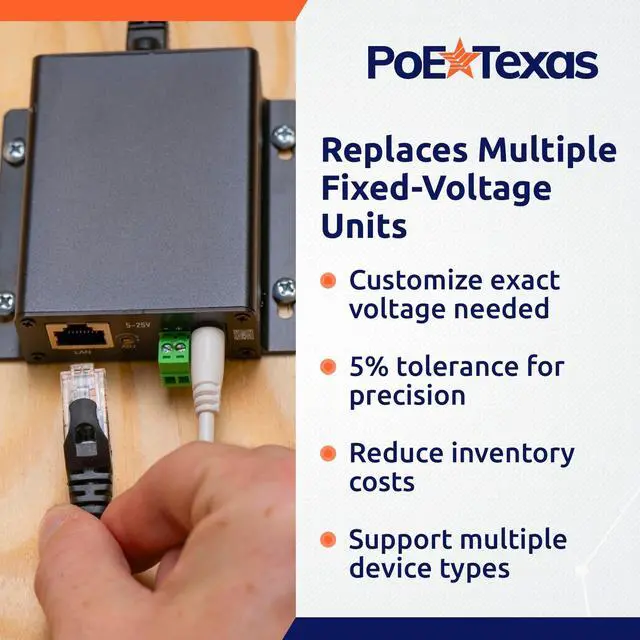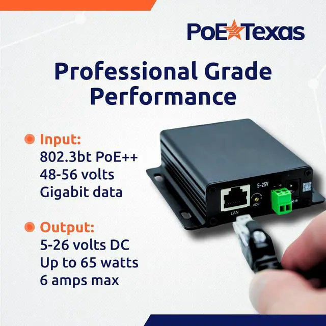 Watt Output: Stop searching for different splitters for each voltage. One unit adjusts from 5 to 26 volts DC at up to 65 watts or a maximum of 6 amps. Powers high-demand devices like IoT devices, routers, cameras, displays, and industrial equipment through an existing PoE network. ^^