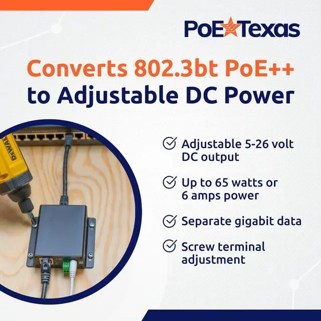 PoE Splitter: Converts IEEE 802.3 bt PoE++ into adjustable 5-26 volt DC output with up to 65 watts or 6 amp. Screw terminal adjustment with 5% tolerance customizes exact voltage for your devices. Compatible with PoE, PoE+, and 802.3 bt PoE++ switches and injectors. ^^ Universal 65