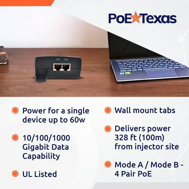 Use it to power PTZ IP Cameras, Desktop Computers, Laptops, WiFi Access Points, LED Lighting, Base Stations, Door Locks, Display POS, and Kiosks. ^^ Plug and play. Our single port PoE adapter / injector transmits 10/100/1000 Gigabit data, delivering lightning fast wired speeds with no loss of signal quality. Compatible with PoE (Type 1), PoE+ (Type 2), and PoE++ (Type 3). UL Listed. ^^ All of our PoE products are backed by a One Year replacement warranty and a 30 Day, no questions asked, return policy.