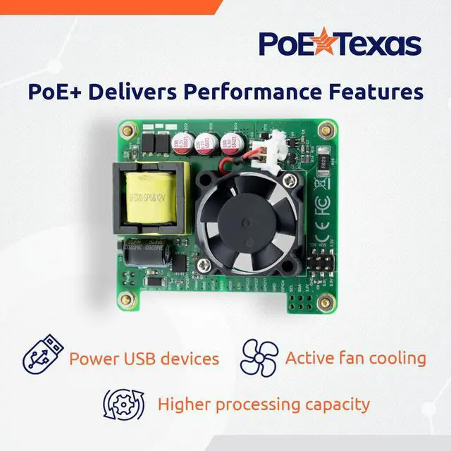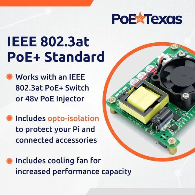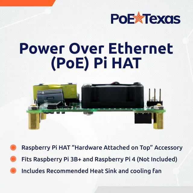 An IEEE 802.3 at PoE+ Solution to match Pi 3B+ and Pi 4 increased performance. PoE Texas has produced a more powerful Raspberry Pi-HAT for Performance Users, smaller than the official version, still with opto-isolation. Designed to work with any IEEE 802.3 at PoE+ switch or 48v PoE+ injector. ^^ Our design fits in the Raspberry Pi Official enclosure and provides up to 20 watts of power for the Raspberry Pi 3B+ and 4 (Not Included) with room for USB accessories, using one cable with Power Over Ethernet ( 802.3 at PoE+). ^^ Smaller and more space efficient than the Official Pi-HAT, made to fit inside most Pi enclosure cases (not included) while taking up less board space.