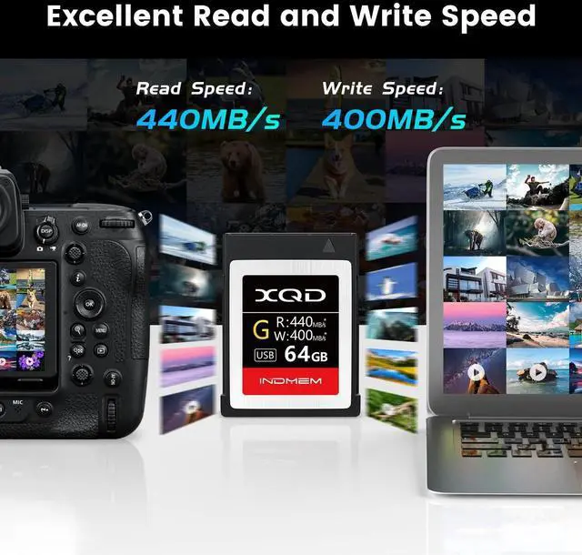 Supports PCIe 2.0 &USB 3.0 - -Both PCI Express Gen2 Interface and USB 3.0 (super speed) are supported for higher performance and easy connection to PCs. ^^ Ultra Read& Write Speed- -Maximum read 440MB/s, and maximum write 400MB/s. ^^ 64GB XQD Performance - -Maximizes performance of XQD cameras, whether 4K video recording or continuous burst mode shooting, or transferring large contents to host devices. ^^ Safe & Reliable- -Recessed pins add contact protection from damage, dust, or electrostatic shock. Can withstand extreme temperatures ^^ 4K Video Recording- -Newly developed controller and unique "EB stream" function are used to achieve stable high frames while avoiding speed drops.
