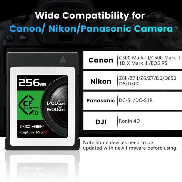 Ultra Read& Write Speed- -Superior performance with transfer speeds of up to 1700MB/s read, 1600MB/s write. ^^ 8K Smooth RAW Videos- -Optimized for Continues 8K RAW Recording to shoot more high quality image. ^^ Select XQD Cameras Backwards Compatible- - Works with Most CFexpress Type B Devices and Select XQD Devices. (Firmware Update Required for XQD Cameras). ^^ Supports PCIe 3.0 and NVMe- -Utilizes PCIe 3.0 and NVMe protocol for unmatched speeds. We provide lifetime service. ^^ Superior Compatibility- -CFExpress Video Memory Card Compatible with Nikon D5, D6, Z6 / Z7/Z9, D850, D500, Panasonic S1 / S1R, Canon EOS-1DX Mark III, Canon EOS R5, Canon EOS C300 / C500 Mark III.