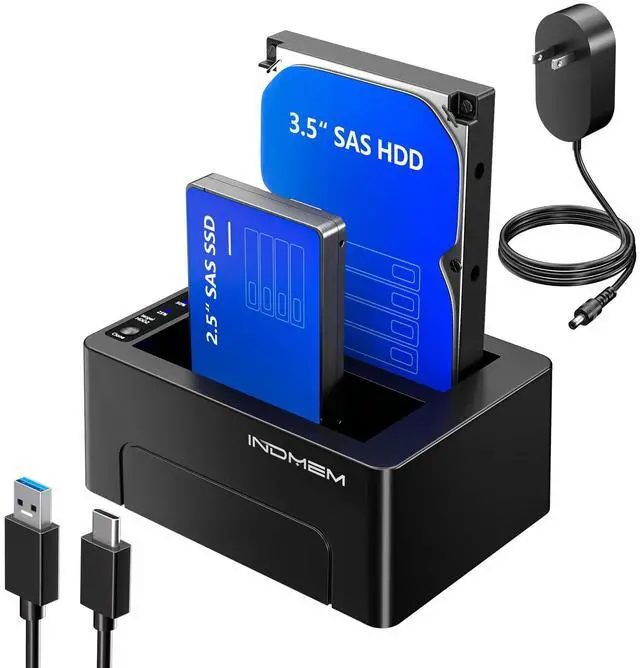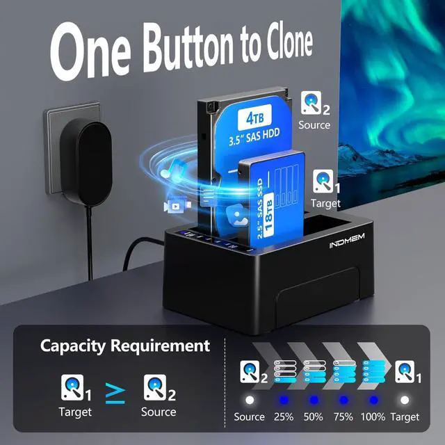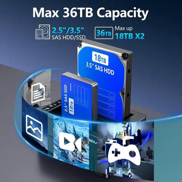 One-Touch Offline Cloning, Works Without a PC- -Simply insert the source and target drives to start cloning. It operates independently, streamlining your workflow for data migration, backup, and distribution, offering true plug-and-play convenience. ^^ High-Speed SAS Interface for Blazing Transfers- -Supports both 2.5 / 3.5 inch SAS and SATA SSD HDD, delivering transfer speeds (6Gbps) far superior to standard interfaces. An Independent 12V 2A power is included to meet the power consumption requirements. ^^ Massive 36TB Capacity, Ready for Future Demands- -Supports drives up to 18TB per bay, for a total capacity of 36TB.