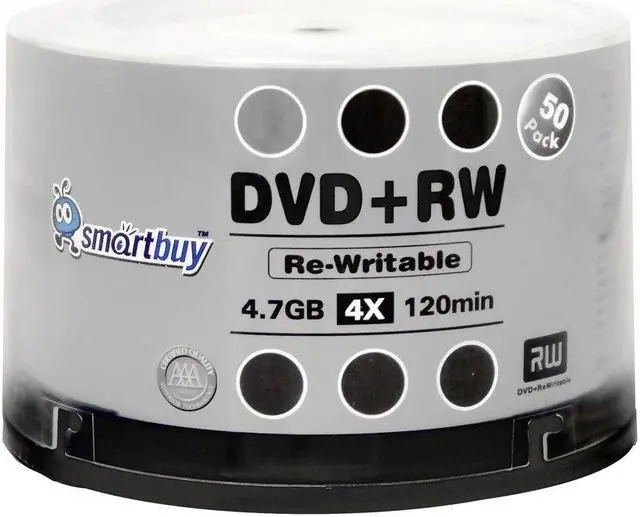 Brand: Smartbuy Type: DVD+RW Speed: 4X Capacity: 4.7GB Ideal for recording up to 2 hours of DVD quality home movies and video clips Read and compatible with most DVD-ROM drives and DVD video players Quantity: 50 Pcs Packing: Spindle/Cakebox