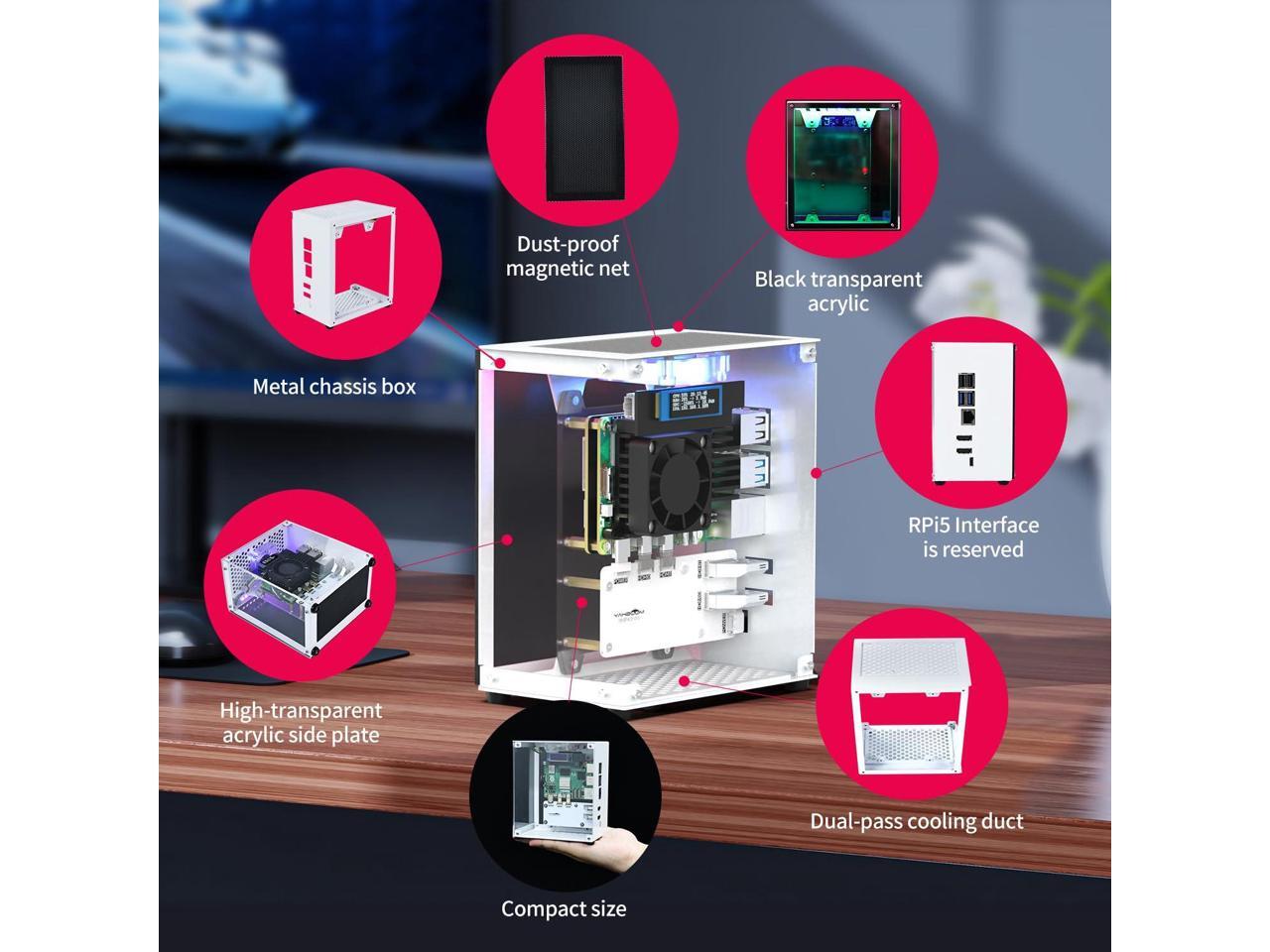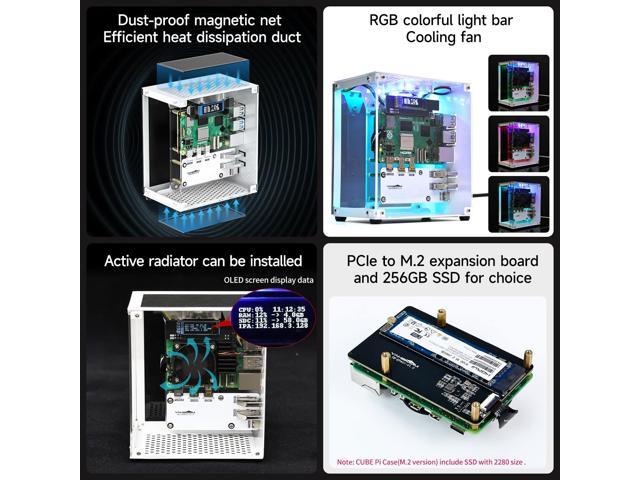 - CUBE Pi is designed for RaspberryPi 5 8GB 4GB 2GBThe shell is made of aluminum alloy, and the 270° panoramic view clearly displays the inside of the shell. The OLED display makes it easier to observe system information. The motherboard external holes are reserved for users to DIY expansion devices.