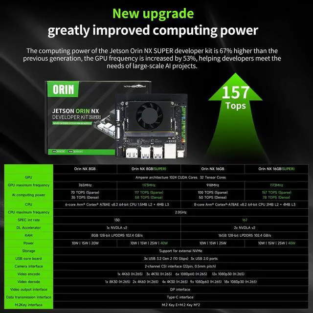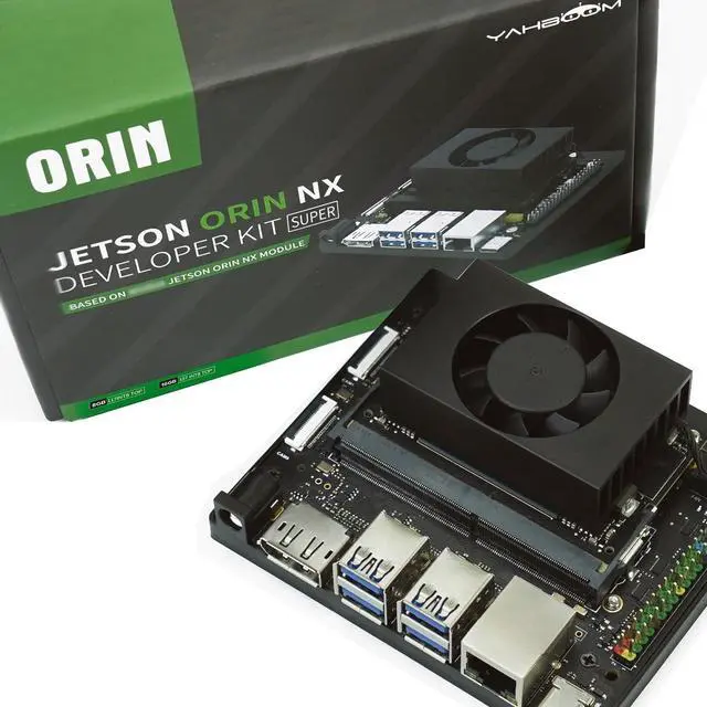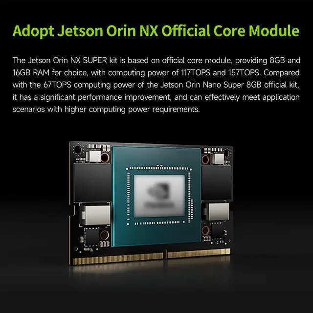 LPDDR5 ^^ 102.4GB /sStorage: Supports external NVMe. ^^ Empowered by Large Al Model, Enhanced Human-Computer InteractionJetson Orin Super leverages three AI models and incorporates an AI voice interaction module. This multimodal visual system matches the scene being described, enabling environmental awareness and AI visual gameplay. Combined with a large-scale voice module and camera, it enables speech-to-text, semantic analysis, natural conversation, and real-time video analysis, enabling advanced embodied AI applications. ^^ Revolutionize the IndustryJetson Orin NX modules deliver unmatched performance and efficiency for small, low-power robotics and autonomous machines, making them ideal for drones, handheld devices, and more. The module can be easily used in advanced applications in manufacturing, logistics, retail, agriculture, medical and life sciences, and comes in a highly compact and energy-efficient package. ^^ Revolutionizing AI with Unmatched PerformanceThe Jetson Orin NX system module adopts the Ampere architecture GPU, a new generation of deep learning and vision accelerators, high-speed I/O, and fast memory bandwidth to support multiple AI application processes. Granular structured sparsity to improve the operating throughput of Tensor Core, and can use larger and more complex AI model development solutions in natural language understanding, 3D perception and multi-sensor fusion.