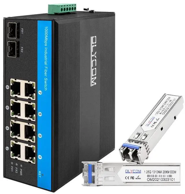 OLYCOM Outdoor Switch Gigabit Ethernet Din Rail Mounted IP40 with 2pcs Industrial SFP Transceivers Dual Fiber SM 20KM LC