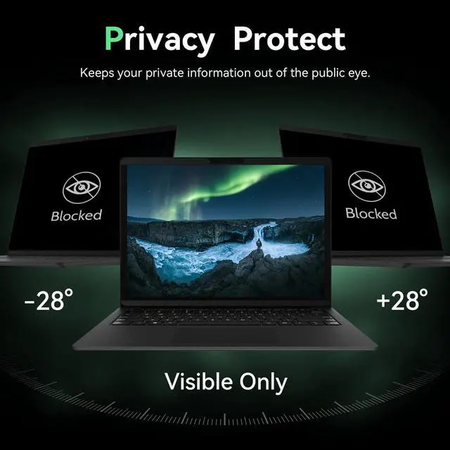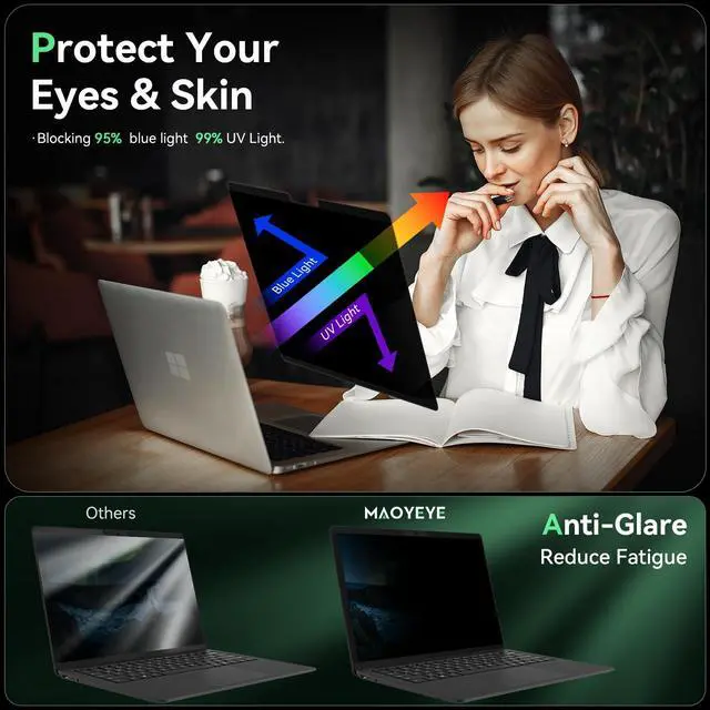 EXCELLENT PROTECTIONThis privacy screen for laptop 5 designed with the most advanced AG anti-glare technology ensure our matte screen protector blocks 93% of blue light and 99% UV light, protecting your eyes and skin from damage