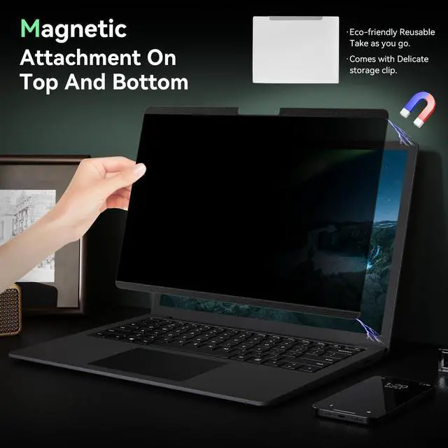REMOVABLE & REUSABLEStrong magnetic attachment on top and bottom make our 13.5 laptop screen privacy shield more stable than othersinstall and remove in a second without residue and air bubbles. What's even sweeter is that it comes with a delicate storage clip, which can keep the anti-spy screen filter well when you take it off