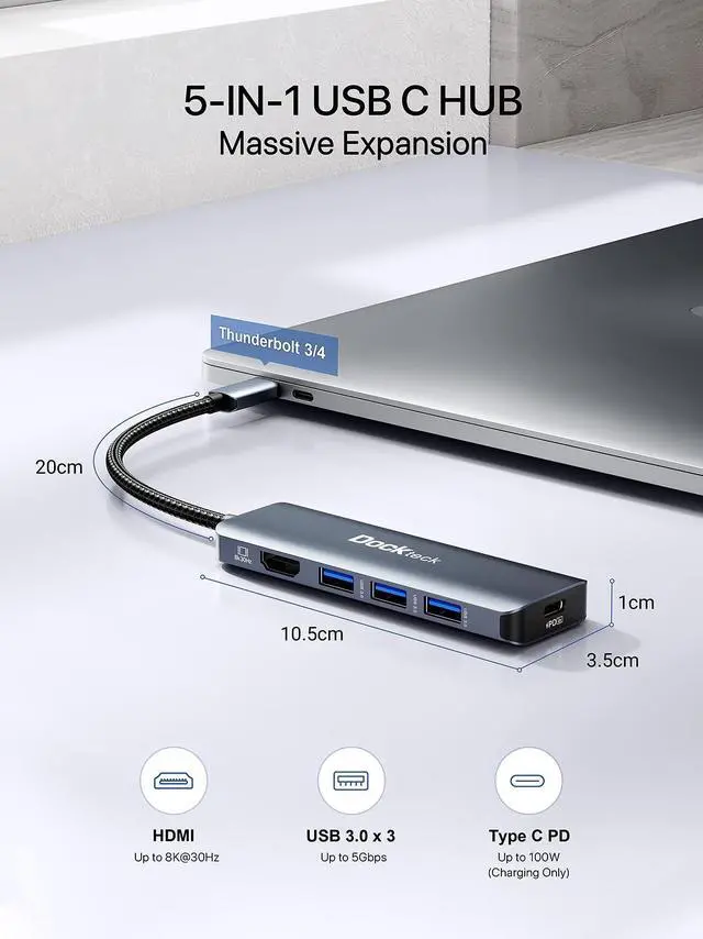 Advanced Tech 5-in-1 USB-C Hub 8K: Gathering 1 x 8K @ 30Hz HDMI, 1 x 100W PD and 3 x USB-A 5Gbps ports in Dockteck Compact USB C dock. Upscale everything you watch for scenes rich in precise detail and texture and with what you need for whatevers next make it easier to be efficient