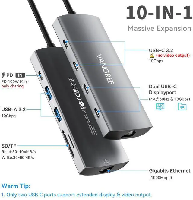10-IN-1 USB C VIDEO OUTPUT HUB: This USB C Hub expands a single Type-C port to 2*USB-A & 2*USB-C 3.2 10Gbps ports, 2*USB-C DisplayPorts (4K@60Hz & 10Gbps data transfer), 100W power delivery port, RJ45 Gigabit Ethernet, and SD/TF card reader, providing an easy and quick transfer or backup of your data.