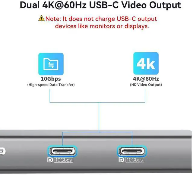 DUAL USB-C DISPLAYPORTS: Dual USB-C display ports support 4K@60Hz extended display, offering seamless extended monitor functionality and high-speed video transmission without needing HDMI interfaces.
