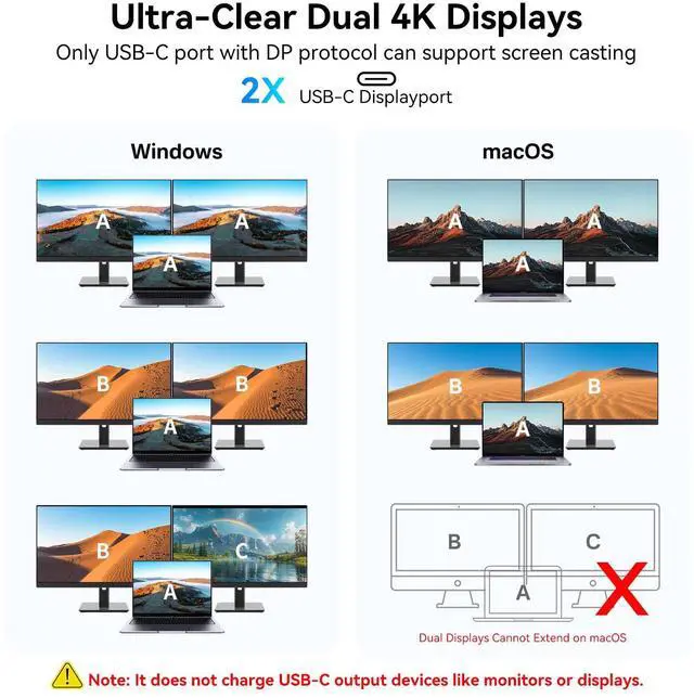 USB C DUAL MONITOR ADAPTER: This USB C dock has dual 4K@60Hz USB-C DisplayPorts to extend dual monitors. Windows supports MST and macOS supports SST. Note: Due to macOS limitations, it can't extend to two different screens. Downward compatible with