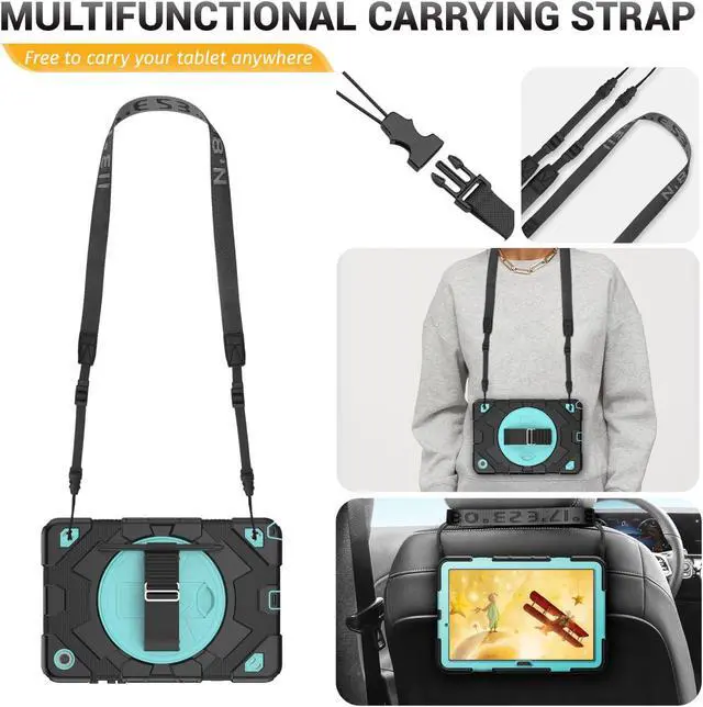 Upgraded Hand Strap & Stand The upgraded strap has more adjustable positions, both kids and adults can use it, also easy to hold the Tablet by one hand and find the most comfortable viewing angle you need. The rotating stand provides a stable support, you can change it to viewing/drawing/typing angles you need, and it can be folded up when not in use.