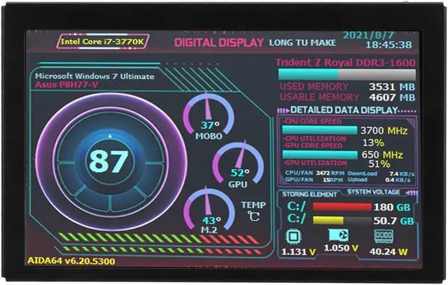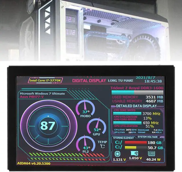 Screen: 800x480 resolution, clear picture, can be placed inside or outside the case. Display not only CPU, GPU, usage and temperature, but also internet speed, date, time, volume, weather forecast.