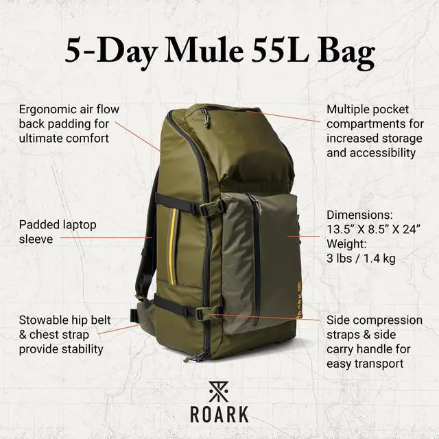 5 DAY MULE BACKPACK: Roarks most versatile purpose built pack has increased storage and accessibility while providing stability through a stowable hip belt. Grab the carry handle when looking for an exit route or to catch your next flight