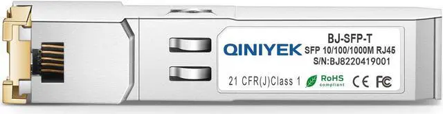 10/100/1000BASE-T SFP to RJ45 Copper Module: Data Rate:10/100/1000M, Interface:RJ45 connector; Reach:up to 100M over CAT.5e Cable Type.