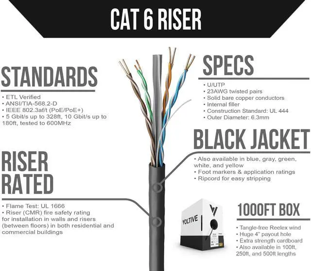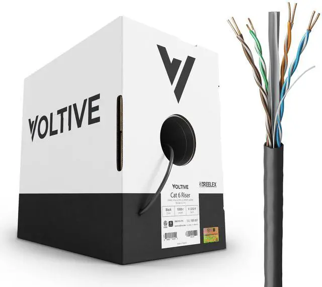 Voltive Cat6 Riser (CMR), 1000ft, Black - Solid Bare Copper Bulk Ethernet Cable - UTP - 600MHz - UL Certified & ETL Verified