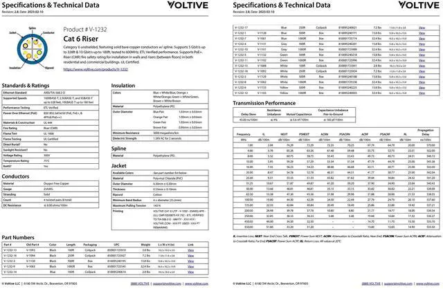 STANDARDS & WARRANTY. Performance (ETL Verified): ANSI/TIA-568.2-D, ISO/IEC 11801-1, IEC 61156-5. Power over Ethernet: IEEE 802.3af/at. Fire safety: UL 1666. Construction: UL 444, CSA 22.2 No. 214, RoHS. Includes Voltive 20 year warranty.