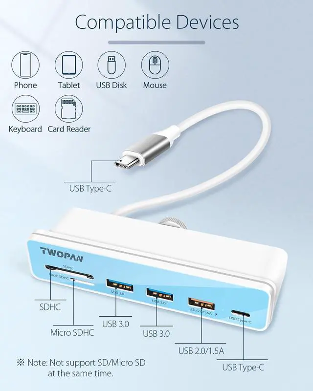 6-in-1 iMac USB C Hub: Upgrade your iMac with our versatile 6-in-1 iMac USB C Hub. With this usb port hub, you gain easy access to 6 essential ports, eliminating the hassle of limited connectivity. Expand your iMac Thunderbolt Port with USB Type-C port, USB 3.0 ports, USB 2.0 port, SD and Micro SD socket