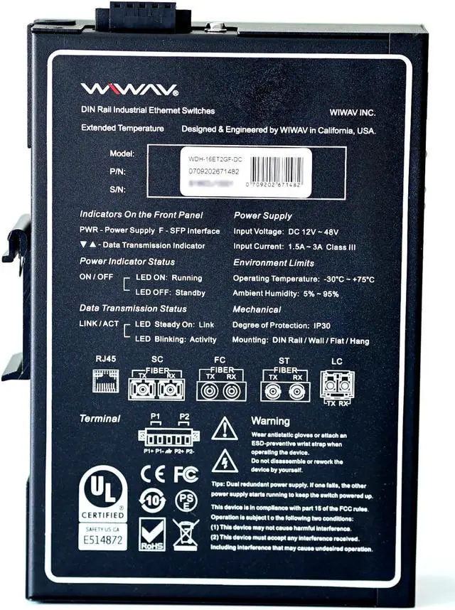 WIWAV WDH-16ET2GF-DC 10/100Mbps Unmanaged 18-Port Industrial Ethernet Switches with DIN Rail/Wall-Mount (UL Listed, Fanless, -30~75)