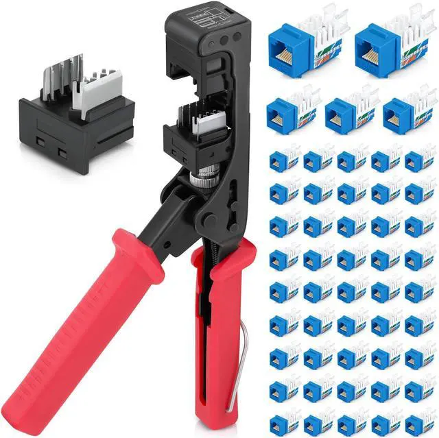 Items: 45Term - 45° Angled Speed Termination Tool + Replacement Head + 45° Angled Cat6 Keystone Jacks in Blue (50 Pack)