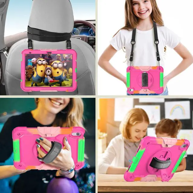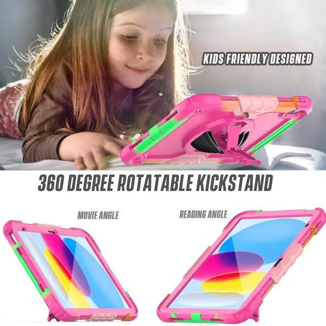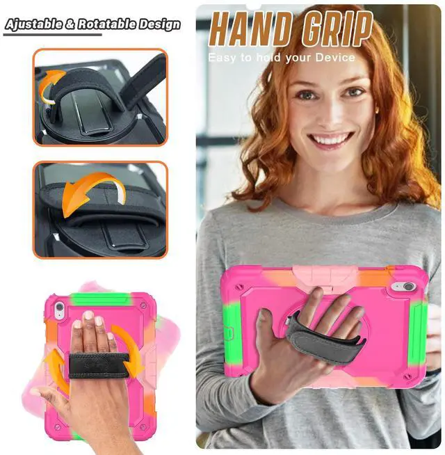 Built-in 360 Rotatable Kickstand and Hand Strap : 360-degree rotating swivel stand supports position of 3 angles(Vertical, Horizontal, and Halfway between), ideal for watching videos, conferences and travelling. Soft rotating handle strap prevents falling of iPad Generation 10th tablet, featuring convenient use for teachers, students, waiters, doctors, nurses and conference presenters.