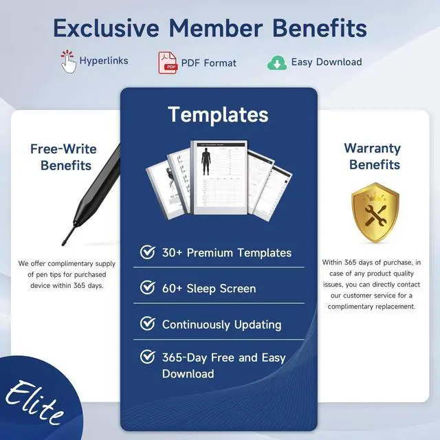 QUALITY SERVICE1 * Case for Remarkable 2, Program Templates, 12 months of Fluent Writing Suit, and free replacement or return for any product issues within 12 months.