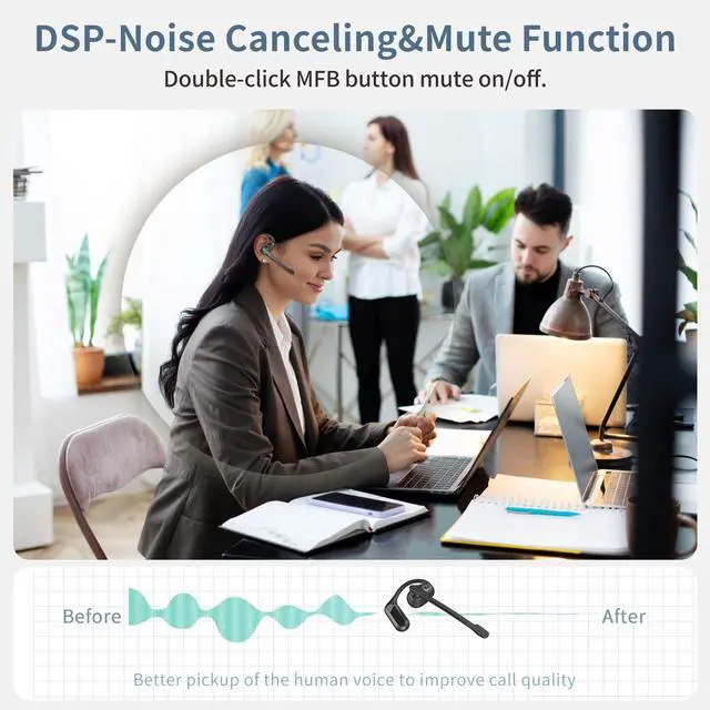 DSP Noise Cancelling Mic & Mute FunctionEarbuds wireless Bluetooth is equipped with DSP noise-canceling mic, which filters out 95% of background noise. Wireless earbuds Bluetooth headphones have 15.4mm dynamic speaker and powerful bass provide immersive listening experience with clear calls wherever go. Wireless earbuds with earhooks have a mute function, which better best companion for office, home working, travel, business, online teaching, conference, etc.