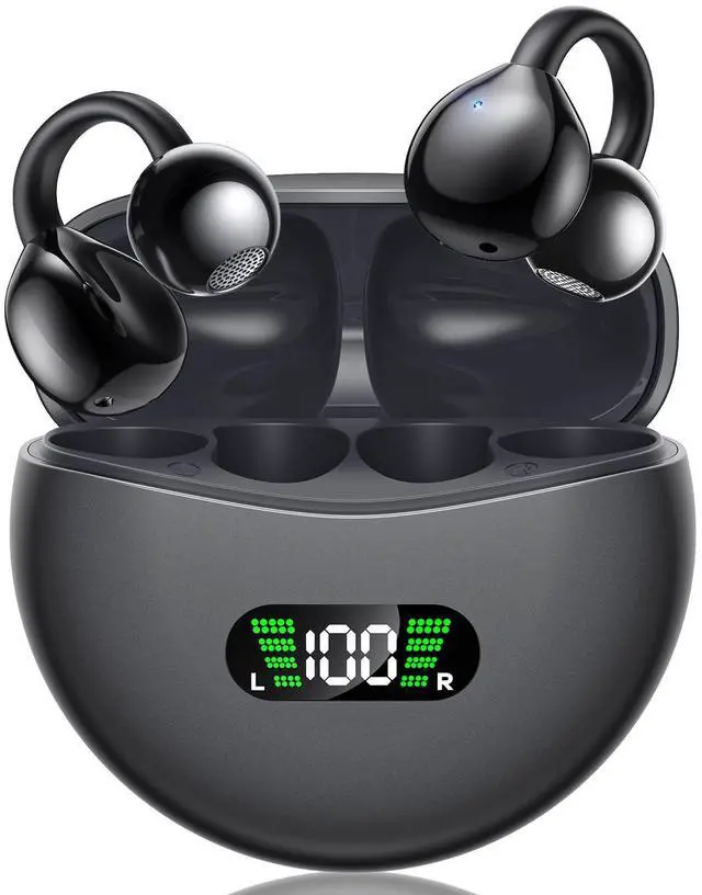 ABCDONG Wireless Earbuds Open Ear Clip On Headphones with LED Digital Display Charging Case Touch Control Bluetooth 5.4 Air Conduction Sport Earphones for Running Fitness, Dark Grey