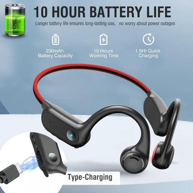 10H Battery Life & Type-C Fast ChargeOpen ear bluetooth headphones get 30 days of standby and 8-10 hours of battery life with 1.5 hours of fast charging. Wireless bone conduction headphones feature fast charging technology and a larger battery capacity, you can charge your open ear headphones using any universal Type-C charging cable.