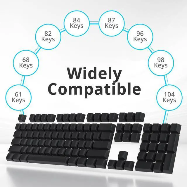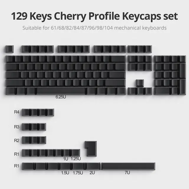 Widely CompatibilityThis keyboard keycap set consists of 129 keycaps, including 104 standard keys and 25 modifiers keys, 61/64/68/82/87/96/98/100/104 ANSI US layouts cherry mx switches keyboards