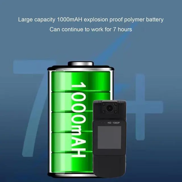 LONG LASTING BATTERY LIFE: Mini body camera comes with a 1000mAh battery, which can record up to 7 hours of continuous video. One key video recording design saves time and ensures timely recording of important pictures.