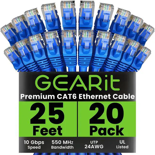 GEARit Cat 6 Ethernet Cable (20-Pack 25 Feet) Cat6 Network Patch, 10Gbps, RJ45, Snagless Cord, Gold-Plated Connectors, Internet for PC, TV, Tablet, Router, Printer, Servers, IT Data Center - Blue