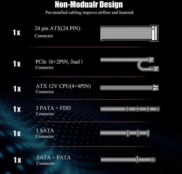 NON-MODULAR CABLESAll cables been pre-installed. black& flat desgin, not ketchup and mustard colored.