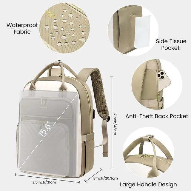 LOVEVOOK 15.6 Inch Laptop Backpack for Women, Large Capacity Work Backpack Purse for Women, Waterproof Travel Day Pack for Teacher Nurse, Khaki-Beige