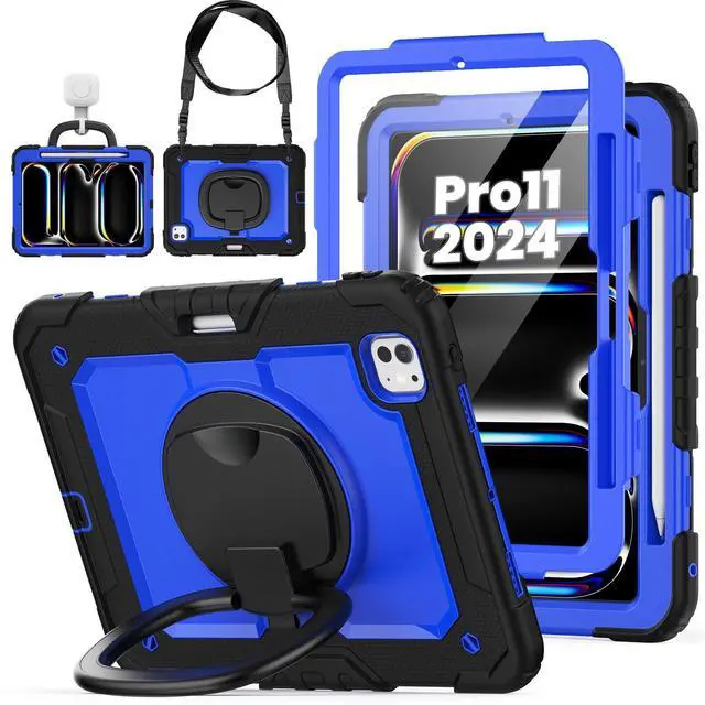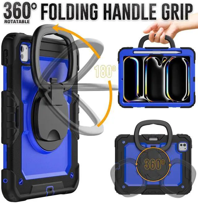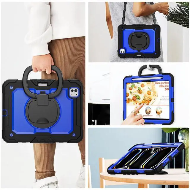 ZSLVPN for iPad Pro 11 Inch Case 2024 M4, Heavy Duty Shockproof Protective iPad 11 Pro Case with Rotating Handle & Stand- Shoulder Strap- Screen Protector- Pencil Holder, Black/Blue
