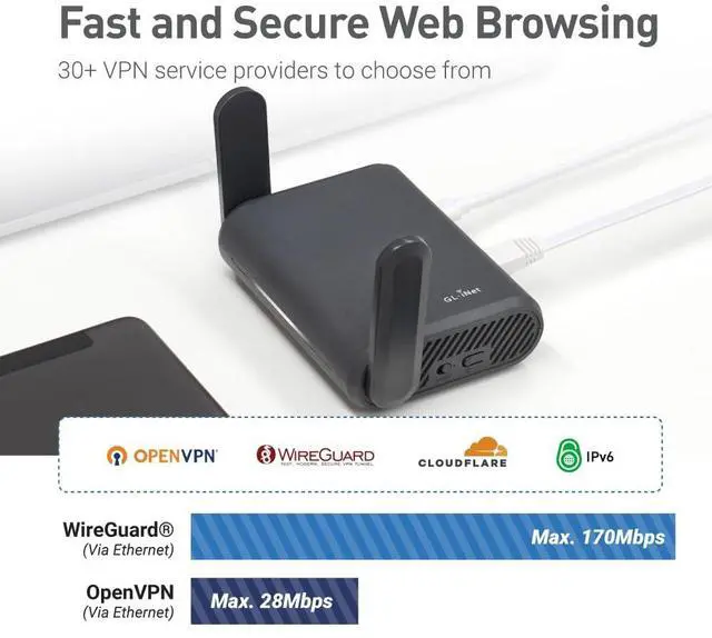 VPN CLIENT & SERVER OpenVPN and WireGuard pre-installed, compatible with 30+ VPN service providers. Max. VPN speed of 28 Mbps (OpenVPN); 170 Mbps (WireGuard)