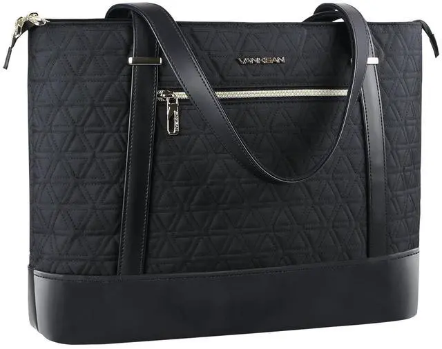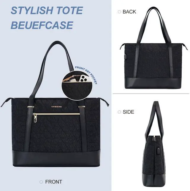 VANKEAN Laptop Bag for Women, 15.6 Inch Work Bag Waterproof Computer Shoulder Bag with USB Port, Large Tote Bag for Work Business Travel, Quilted Black