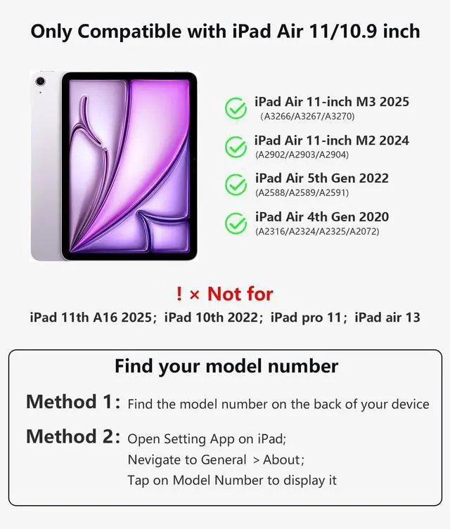 Compatible with iPad Air Series: This air keyboard case is compatible with iPad Air 11-inch (M2) 2024 (Model Number: A2902 / A2903/ A2904), for iPad Air 11-inch (M3) 2025 (A3266 / A3267/ A3270), for iPad Air 5th Generation 2022 10.9 inch (A2589/A2591/A2588), for iPad Air 4th generation 2020 10.9 inch (A2072/ A2316 / A2324 / A2325). Not compatible with any other devices, please check the back bottom of your tablet carefully to find the Model Number before purchase
