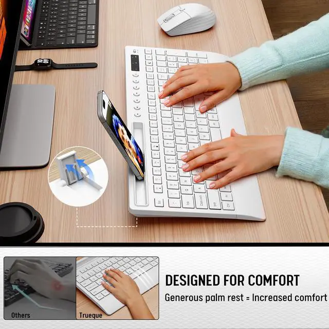 White Wireless Keyboard and Mouse Combo - Full-Size Quiet Keyboards with Palm Rest, Phone Holder, Multimedia Keys, Batteries Included, Office Key Board Compatible with Windows, PC, Laptop - Trueque