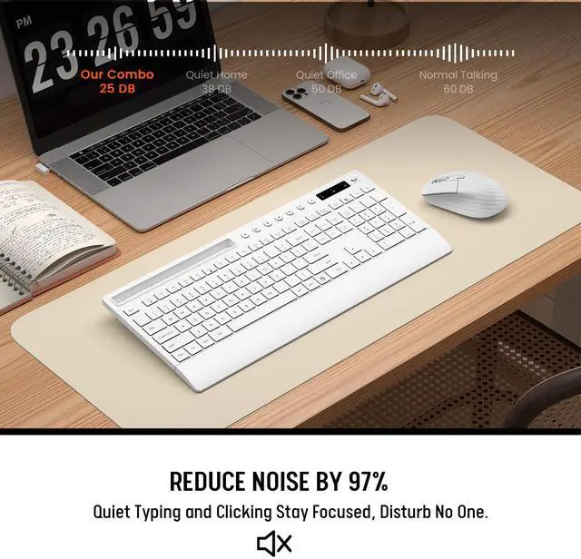 LESS NOISE, MORE FOCUS: Low-profile keys offer fluid, quiet typing. Silent experience in a wireless USB mouse. Get the same click feel with over 97% noise reduction, even the rubber scroll wheel glides silently