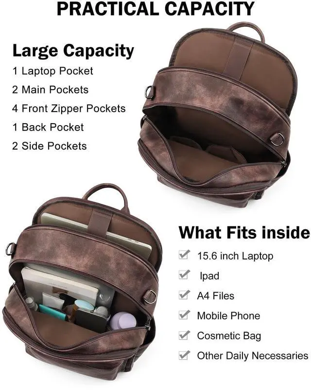 Independent Laptop Compartment:This leather laptop backpack is designed with a dedicated padded compartment to securely hold laptops up to 15.6 inches, keeping your device protected from bumps and scratches. Multiple interior pockets of varying sizes are perfect for organizing essentials like notebooks, chargers, and headphones. The large top zippered opening allows for quick and hassle-free access to your laptop without disturbing other items, making it ideal for work, school or travel